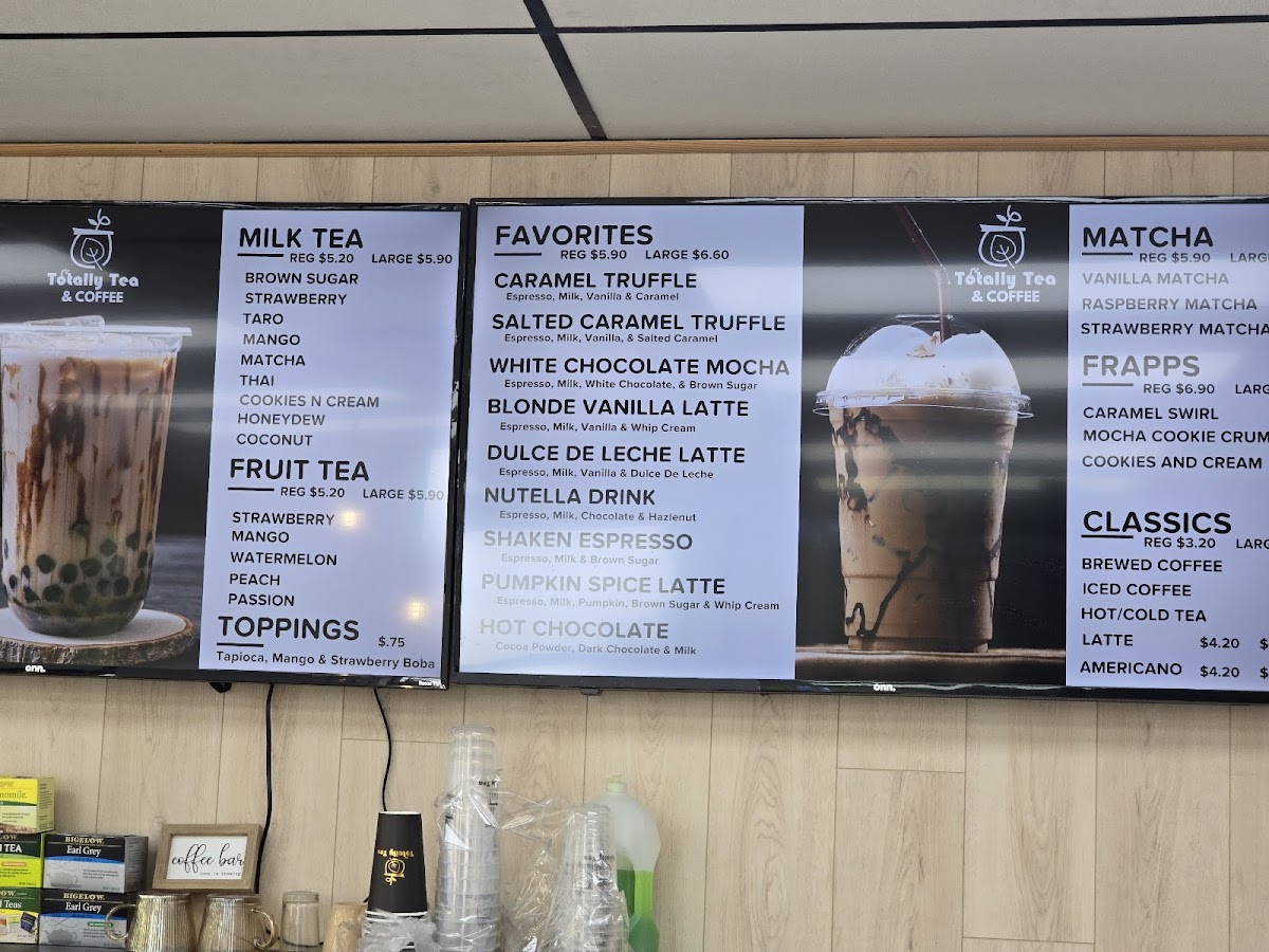 Welcome to Totally Tea & Coffee, a delightful oasis located in Dallas, TX. This newly opened shop focuses on offering an array of carefully crafted beverages that cater to both tea and coffee lovers. The menu features an enticing selection of fruit teas, including the refreshing Strawberry Fruity and Mango Fruity, all priced at a reasonable $6.08. Coffee enthusiasts can indulge in favorites like the rich White Chocolate Mocha and Dulce De Leche Latte, each for just $6.90.